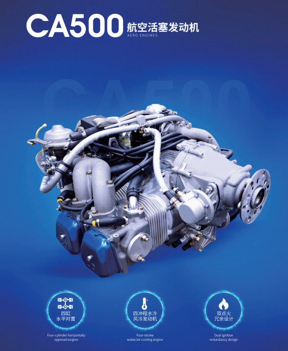 CA500型航空活塞发动机采用先进材料和功能部件,具有高安全性、高性价比、高效率等综合优势,可满足轻型运动类航空器和限用类无人驾驶航空器等动力需求,综合性能达到同类型航空活塞发动机的国际先进水平。