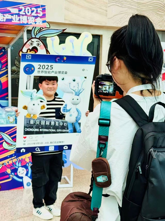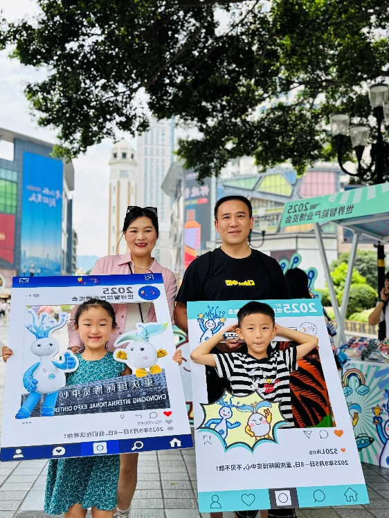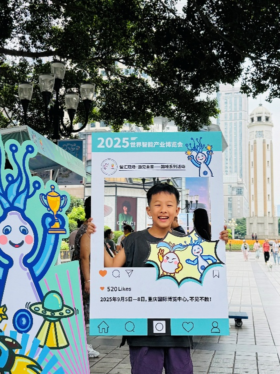活动现场的打卡区,直接变身“网红聚集地”!设计超萌的拍照框,搭配2025世界智能产业博览会专属的卡通元素,不管是亲子家庭温馨同框,还是朋友们搞怪互动,都能拍出超有氛围感的照片。看小朋友们兴奋地钻进拍照框,露出灿烂笑脸;大朋友们也纷纷加入,定格下与智博的专属瞬间。参与打卡还能领取定制手扇,扇面上的智博元素可爱又精致,拿在手里,仿佛把智博的活力也一并 “扇” 了出来!