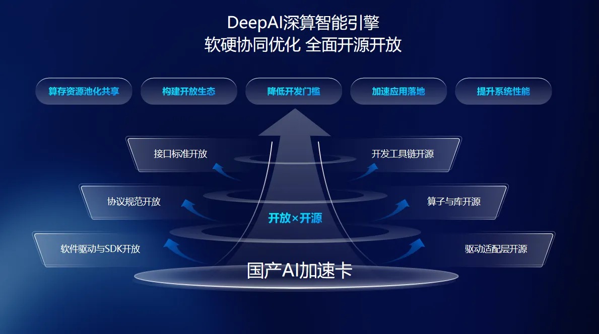 杜夏威坦言,我们开源开放“DeepAI深算智能引擎”,目的在于整合、协同国产GPGPU厂商资源,共同打造中国“类CUDA”生态,共同定义并推广软硬件协同优化标准,最终形成自主生态,提升中国AI在全球范围内的竞争力。