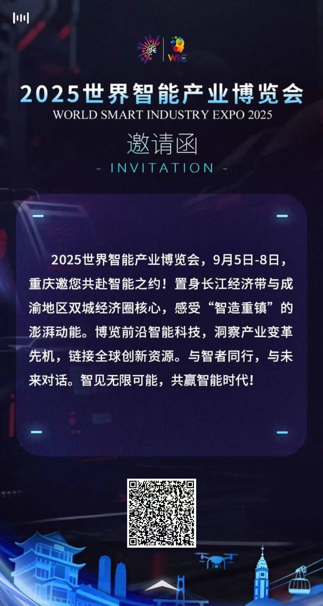 2025世界智能产业博览会,9月5日-8日,重庆邀您共赴智能之约!置身长江经济带与成渝地区双城经济圈核心,感受“智造重镇”的澎湃动能。博览前沿智能科技,洞察产业变革先机,链接全球创新资源。与智者同行,与未来对话。智见无限可能,共赢智能时代!