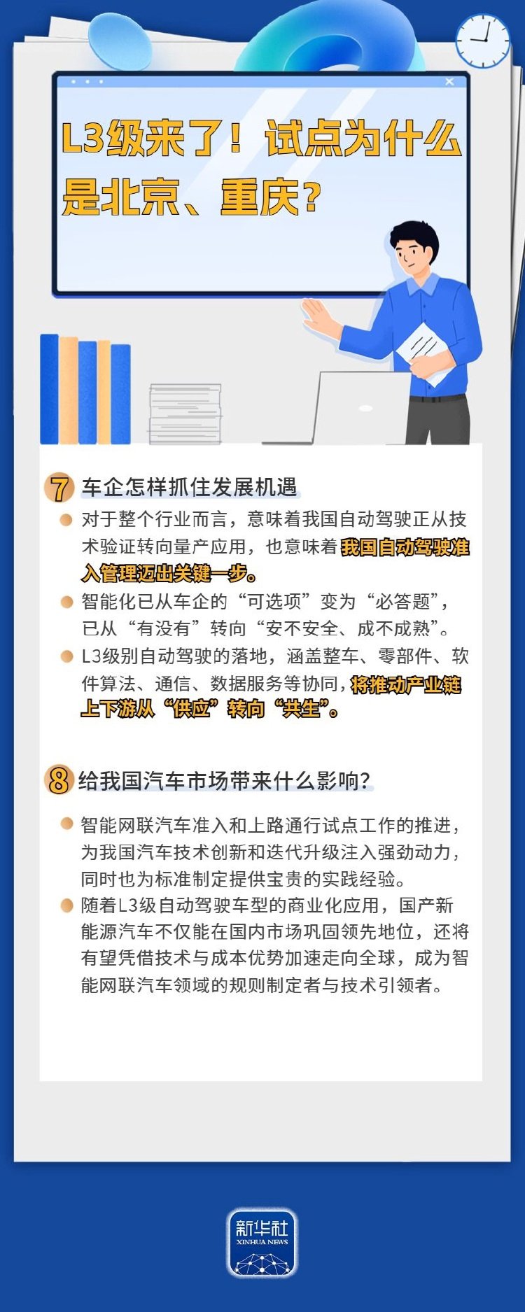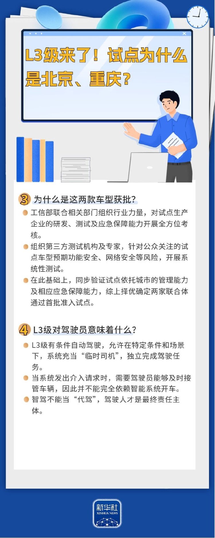 新华社消息,近日,工业和信息化部正式公布我国首批L3级有条件自动驾驶车型准入许可,两款分别适配高速路段和城市拥堵的车型将在北京、重庆两地指定区域开展试点。L3级为啥选择北京、重庆作试点城市?作为消费者我们需要了解什么?试点将给行业带来哪些发展机遇?这组海报为你解读。