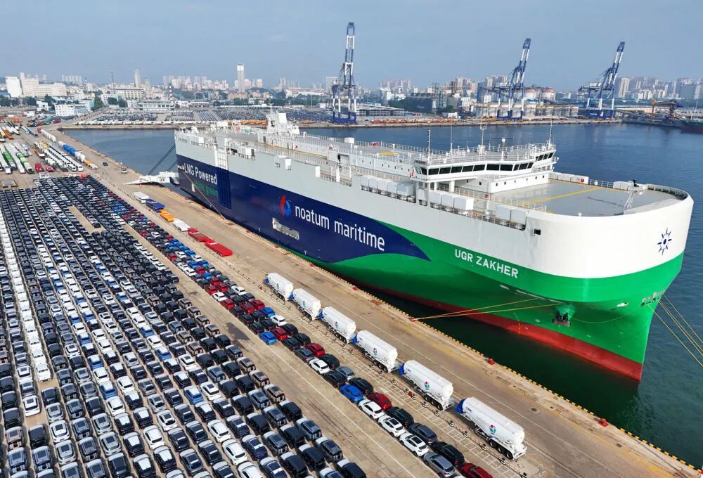 6月29日,汽车运输船在山东港口烟台港装运出口汽车。新华社发(唐克 摄)