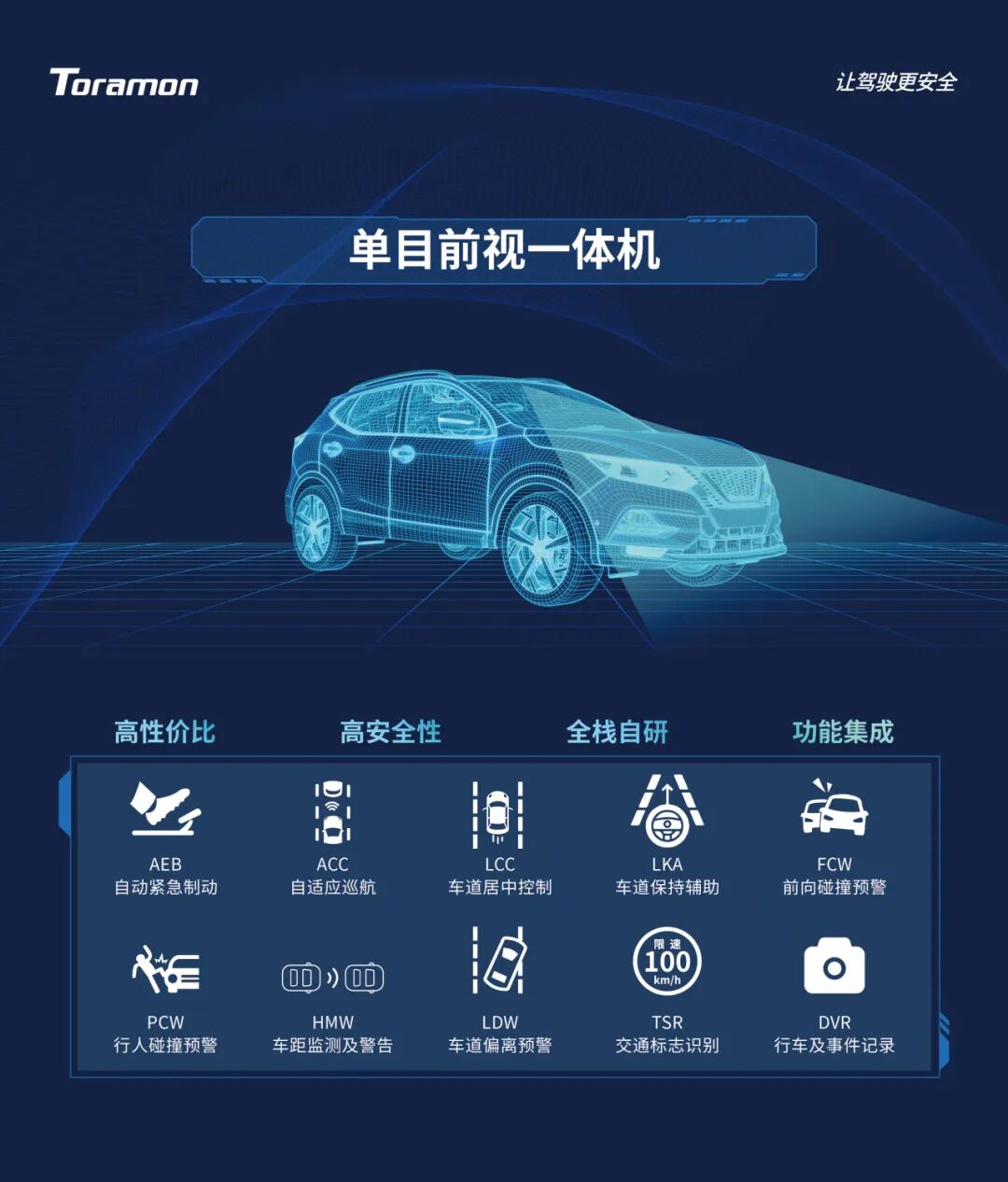 仅用单颗摄像头和2 TOPS算力,就能支持AEB、ACC、LKA等多项智驾功能,并且创新融合DVR行车记录功能于一体,以超高性价比满足乘用车与商用车需求。