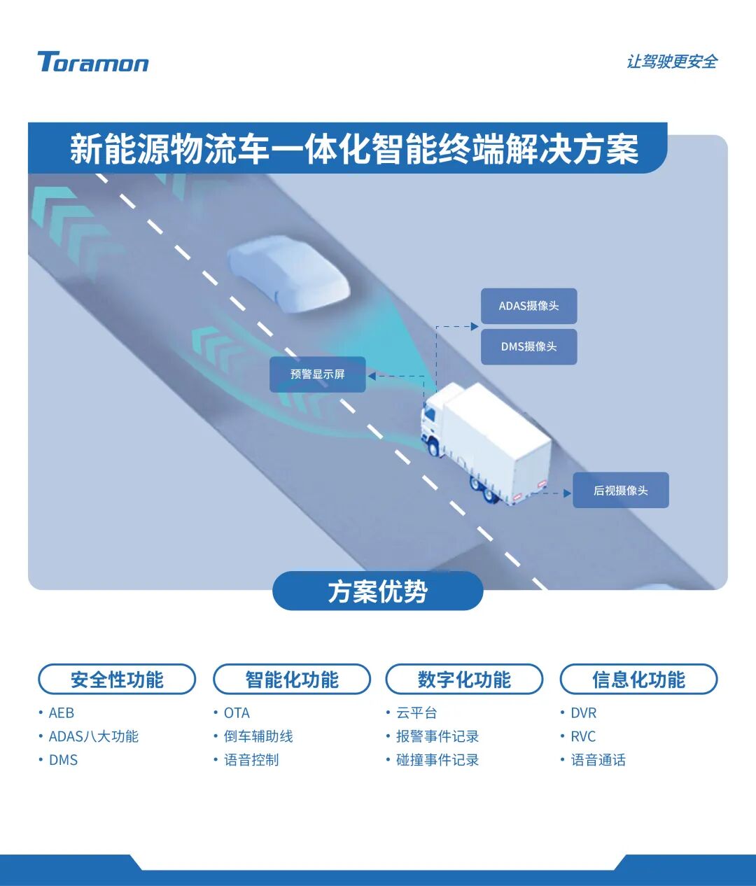 产品涵盖前向ADAS、DMS驾驶员监控、RVC倒车辅助(支持倒车影像辅助和碰撞风险监测)、DVR及云端数据管理,助力新能源物流车智能化升级。