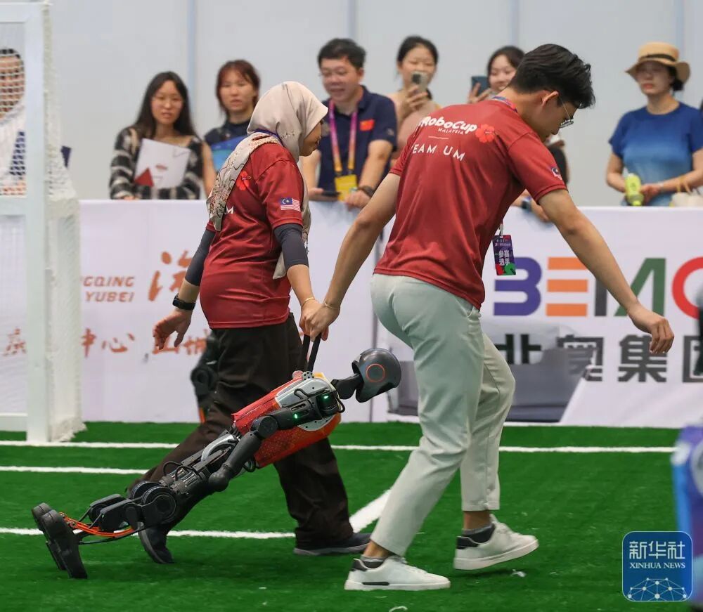 ▲9月5日,在机器人3V3足球赛中,工作人员将故障机器人抬出场外。
