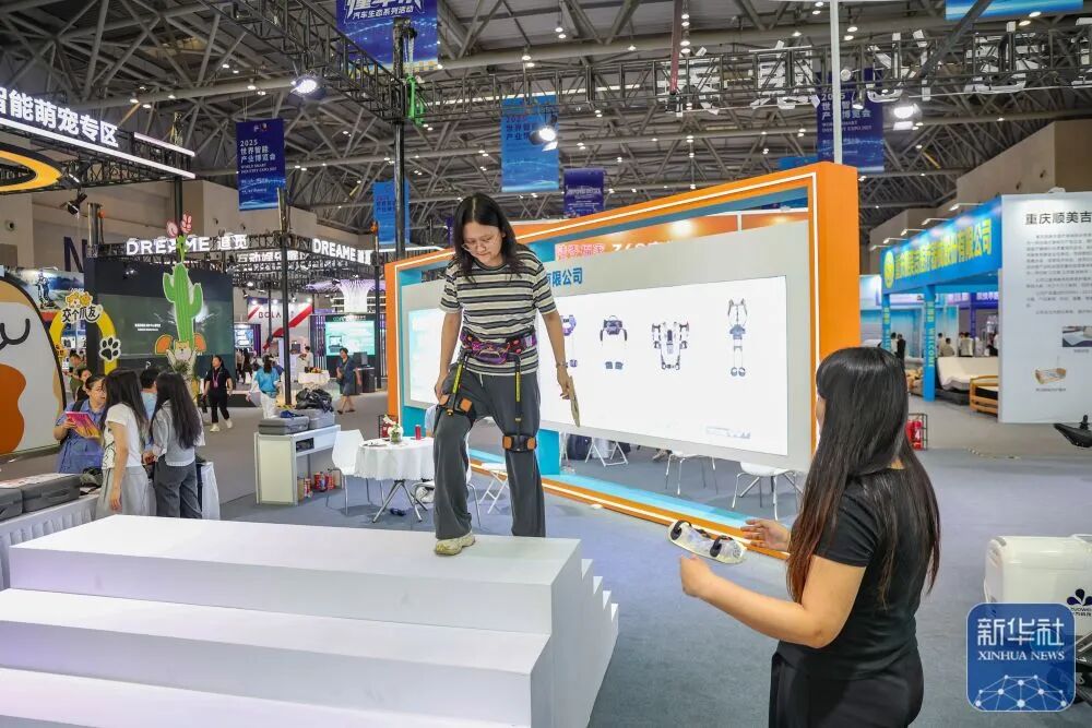 ▲9月5日,观众在2025世界智能产业博览会上体验外骨骼机器人。