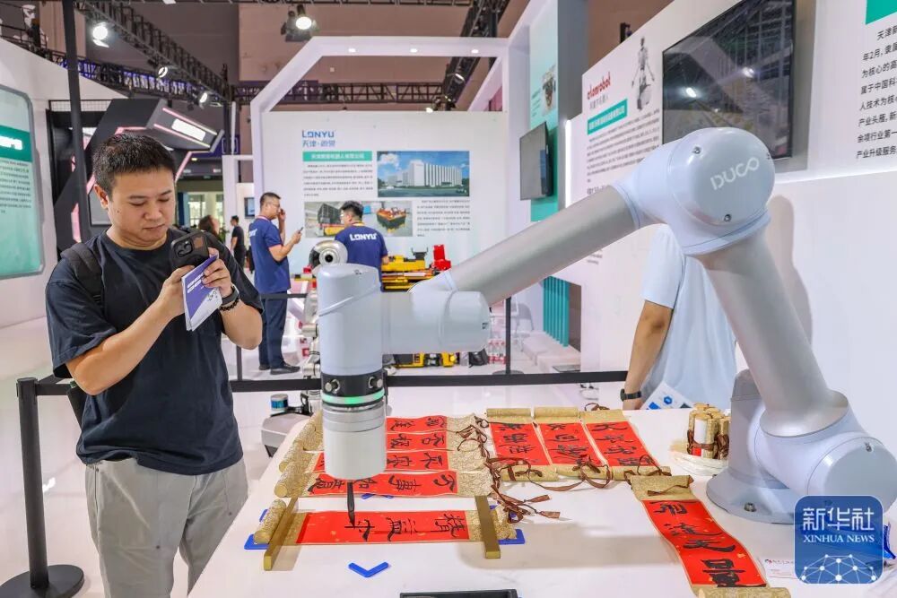 ▲9月5日,观众在2025世界智能产业博览会上观看智能机器人书写毛笔字。