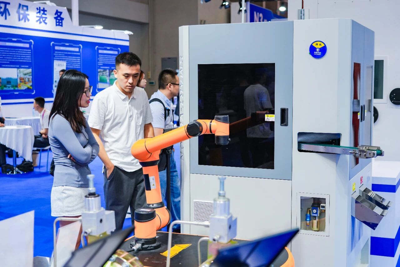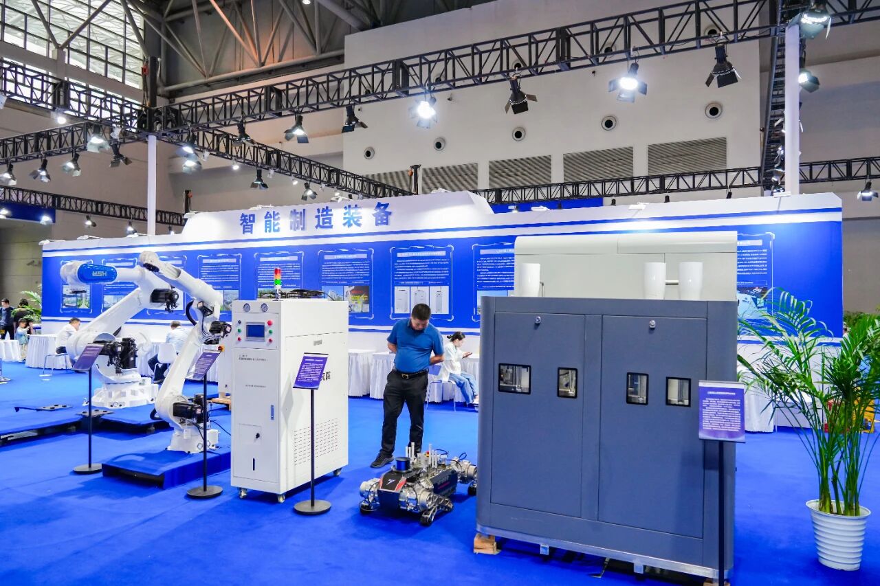 在智能制造装备展区,展示了工业机器人、特种巡检机器人、工业母机等装备。其中,华数机器人的大负载工业机器人HSR-JR6210支持多传感器接入、多种工业总线,可高效胜任新能源汽车、电池行业核心工序;江东机械的高压树脂传递模塑成型压机,突破了四角调节技术的国际垄断、滑块高精位置控制悬停技术。