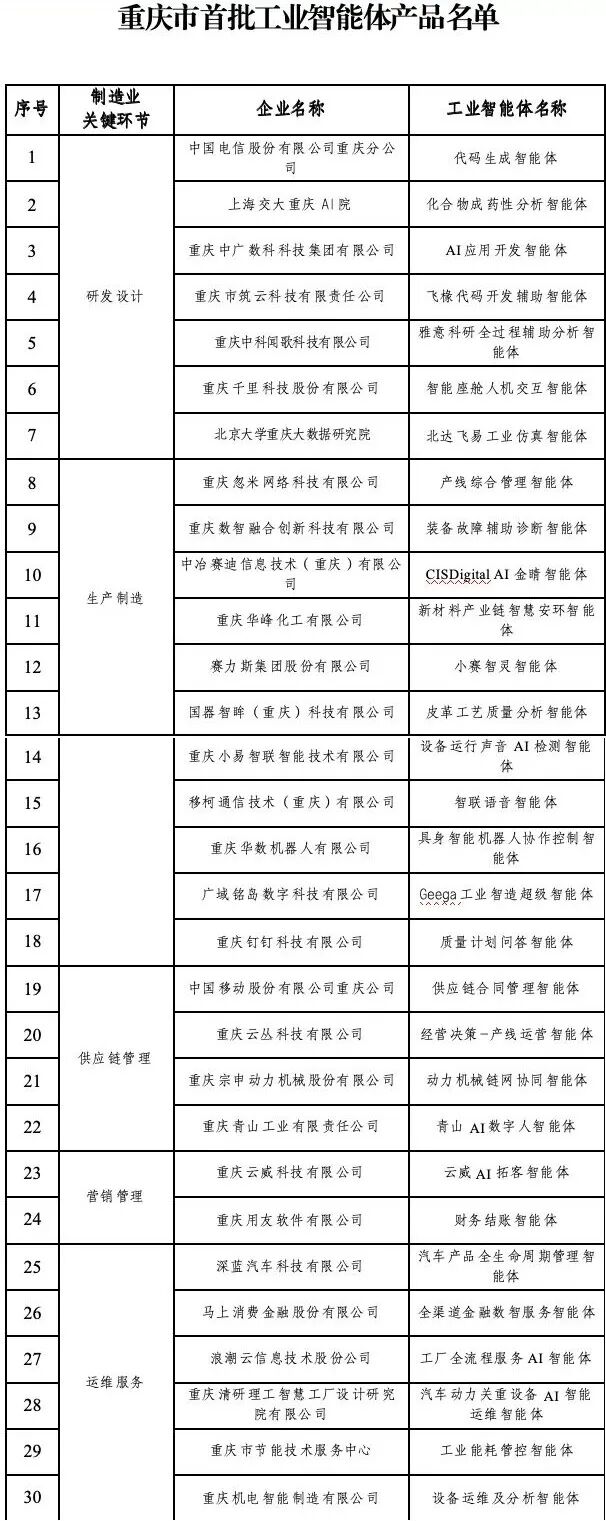 这批智能体产品覆盖研发设计、生产制造、运维服务、供应链管理、营销管理等制造全链条关键环节,深度融合重庆制造业多年积累的工艺知识、管理经验和产业逻辑,旨在通过人工智能技术重构产业生态组织方式,强化体系协同能力,打造赋能研发设计的‘知识引擎’,优化生产流程的‘数字工匠’,提升质量管控的‘检测专家’,重构供应链的‘智慧枢纽’,为新质生产力培育和现代化产业体系建设注入新动能。