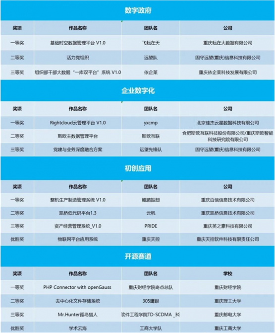 激烈而精彩的角逐后,经大赛组委会专家综合评审,从方案创新性、技术领先性、商业前景性及社会价值4个维度出发,最终4个赛道分别产生了一等奖、二等奖、三等奖。重庆耘在大数据有限公司、北京佳杰云星数据科技有限公司、重庆百信信息技术有限公司、重庆财经学院的参赛团队分别获得数字政府、企业数字化、初创应用、开源赛道的一等奖,他们将代表重庆赛区,进入全国半决赛的角逐。
