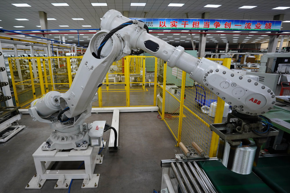 5月18日,在沙河市一家玻璃新材料企业,机械手臂在搬运玻纤制品。(田晓丽 摄)