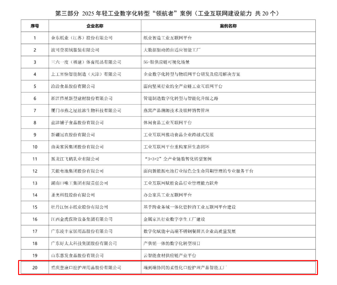 其中,重庆登康口腔护理用品股份有限公司(简称“登康口腔”)申报的《端到端协同的柔性化口腔护理产品智能工厂》入选2025年度轻工业数字化转型“领航者”案例(工业互联网建设能力)。