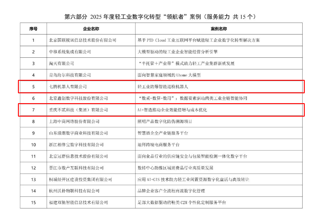 七腾机器人有限公司(简称“七腾机器人”)申报的《轻工业防爆智能巡检机器人》和重庆不贰科技(集团)有限公司(简称“不贰科技”)申报的《AI+智造推动企业效能倍增与成本优化》入选2025年度轻工业数字化转型“领航者”案例(服务能力)。