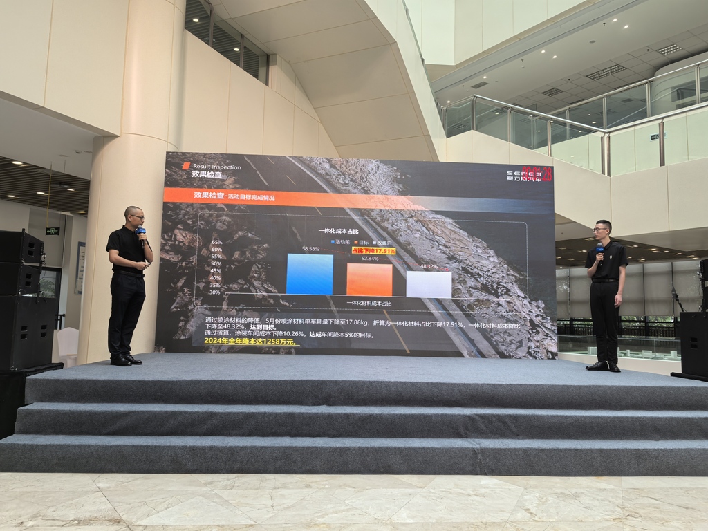以本次交流活动中,赛力斯汽车有限公司质量小组(QC小组)的“降低F2涂装一体化材料成本占比”成果为例,通过推行“脉冲式清洗”和“慢速填充”两项标准程序,成功解决机器人换色污染问题,该项目实现单车材料消耗降低5.82公斤,成本减少202.5元,年累计降本达1258万元。同时,面漆线生产净节拍由41.5JPH提升至43JPH,效率提高3.61%,日节约能耗及人工成本约2万元,单车VOCs排放量降低1.52kg,年减排约312吨,实现了经济效益与环境效益的双赢。