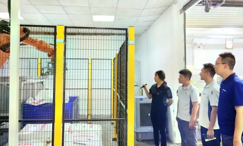▲重庆海尔洗衣机党支部成员巡检机械手搬运粉碎料的作业情况。受访者供图