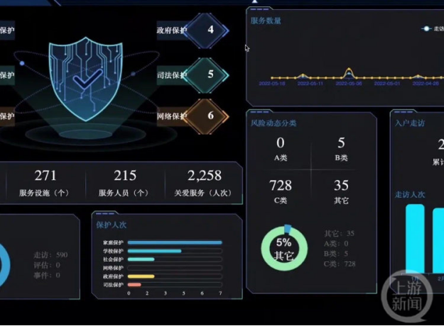 智慧未成年人保护系统对家庭保护、学校保护、社会保护、网络保护、政府保护、司法保护“六大保护”进行整合,通过基层定期走访,实时更新基本数据、统计分析需求,让未成年人保护工作一键报告及时处置,并构建起未成年人关爱保护网络。