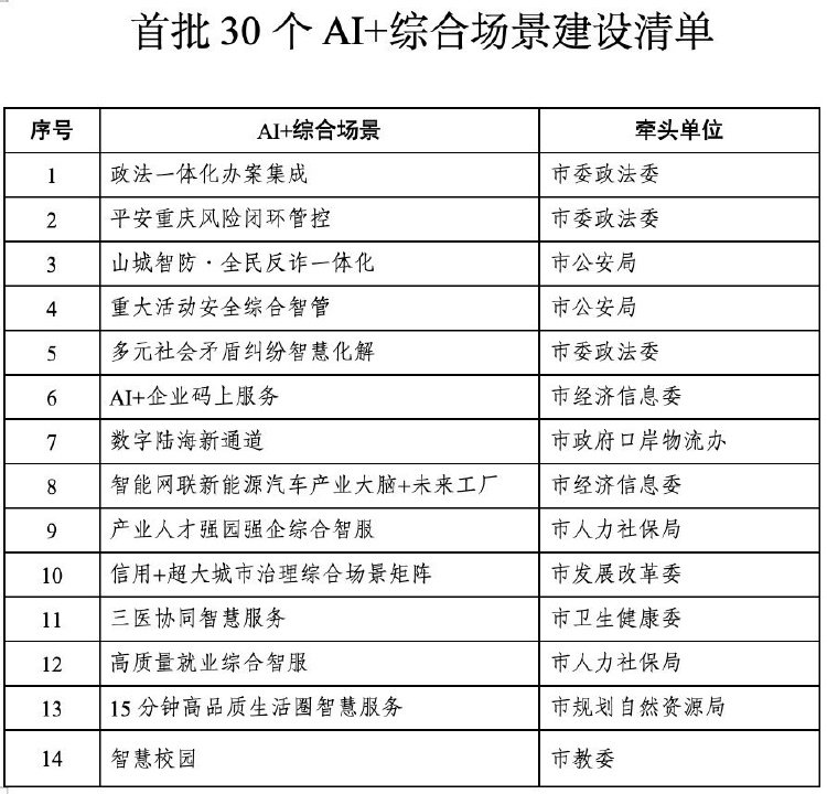 8月28日,数字重庆建设领导小组办公室(以下简称“市数建办”)印发《加快推进AI+综合场景建设工作方案》,并发布《首批30个AI+综合场景建设清单》。这是重庆市深入贯彻落实中央“人工智能+”行动部署,落实数字重庆建设推进会精神,推动人工智能与数字重庆建设双向赋能的重大改革举措。