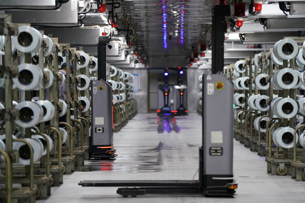 5月18日,在河北沙河市一家玻璃新材料企业,智能搬运车在车间工作。(田晓丽 摄)