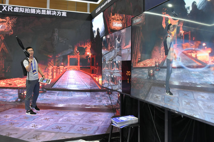 在洲明科技与成都索贝XR虚拟拍摄系统展台,一块横跨两面墙的显示屏正在播放游戏“地下城堡”的画面,观众走到显示屏前,面前的摄像机立刻将他的身影“捕获”,旁边电视屏幕上播放的实时画面中,观众完美地融入到游戏影像中,仿佛身临其境。