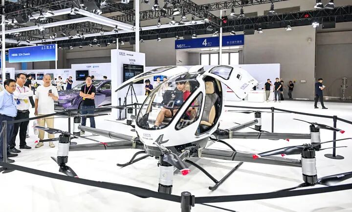 ▲2025年9月5日,在重庆举行的2025世界智能产业博览会上,观众在长安汽车展区参观、体验“飞行汽车”。新华社记者 王全超 摄