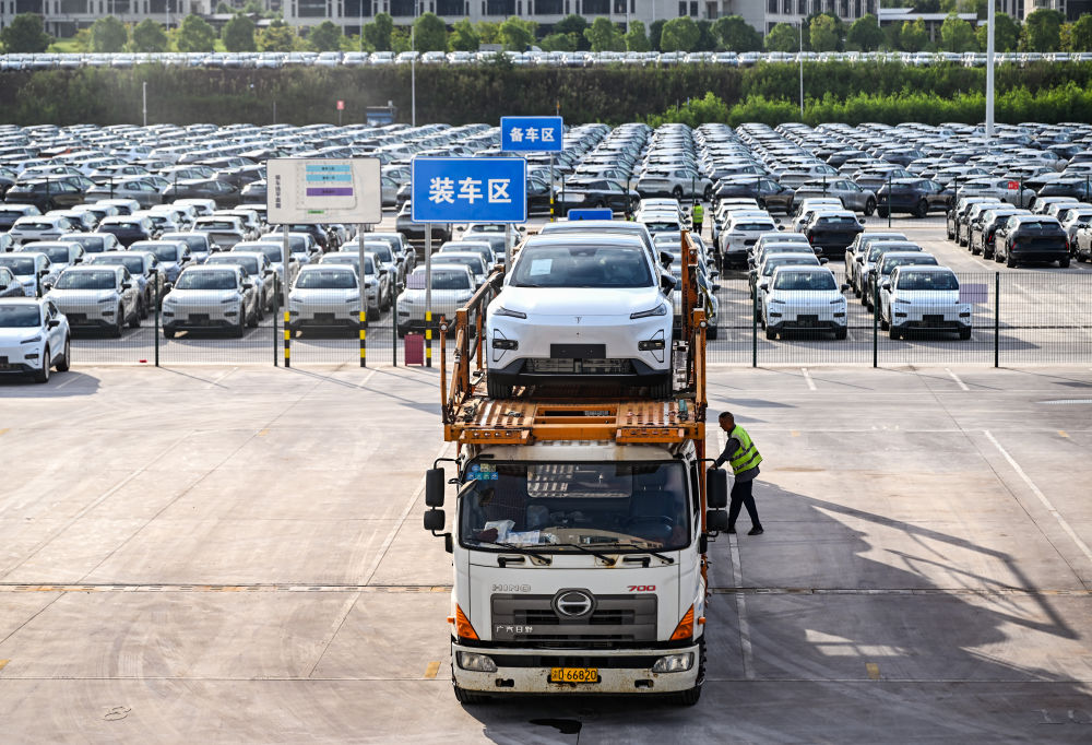 9月18日在位于重庆市渝北区的长安汽车数智工厂整车分拨中心拍摄的新能源汽车装车现场。