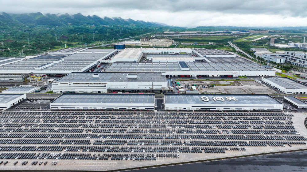 9月19日在位于重庆市两江新区的赛力斯汽车超级工厂拍摄的新能源汽车(无人机照片)。