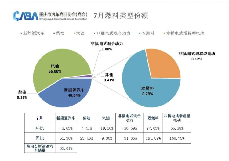 新能源汽车持续渗透,占比突破40%。新能源汽车7月销量同比增长51.38%,纯电车型占比达62.01%。燃油车销量占比仅占56.8%。特别是理想、埃安等车企单月销量破千辆,表明重庆消费者对新能源接受度越来越高。