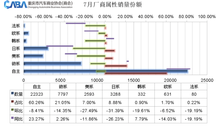 数据显示,重庆车市,中国品牌7月销量达22323辆,同比增长23.27%,占比高达60.26%;德系品牌7月销量达7797辆,同比增长2.26%,占比达21.05%。与此同时,美系、日系、欧系品牌持续下滑。