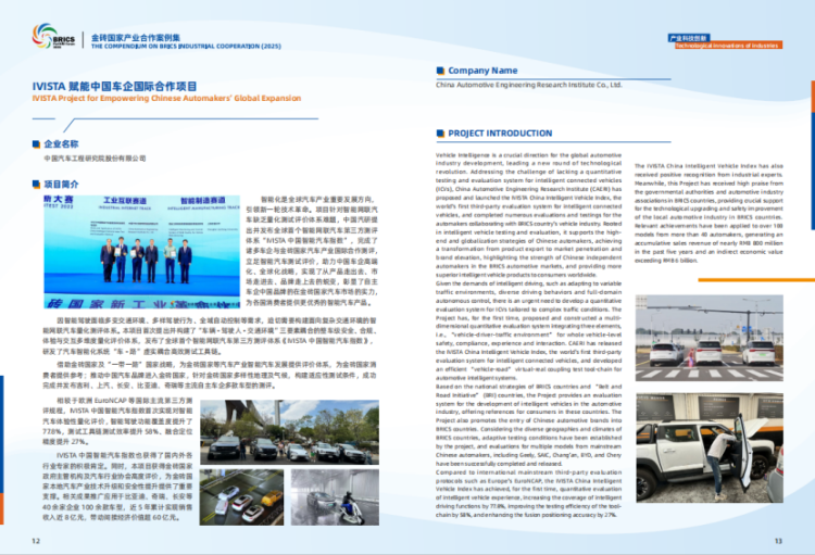 9月17日,记者从市经济信息委获悉,重庆申报的中国汽车工程研究院股份有限公司“IVISTA赋能中国车企国际合作项目”成功入选《2025金砖国家产业合作案例集》。