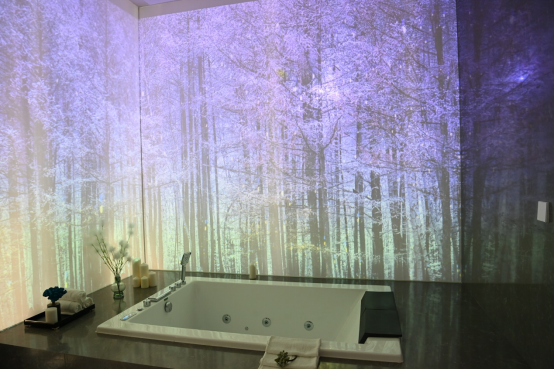 19:00一天的劳累后想要泡个热水澡,只要召唤一声,浴缸中便灌满了38℃的热水,让最舒适的水温缓解一天的疲劳。在电动浴缸按摩的同时,旁边的大屏上还播放着山水美景,十分惬意。