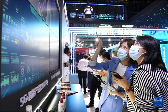 8月23日,在2021智博会现场,工作人员(前左)向观众介绍“5G 智能制造”的应用。新华社记者 唐奕 摄