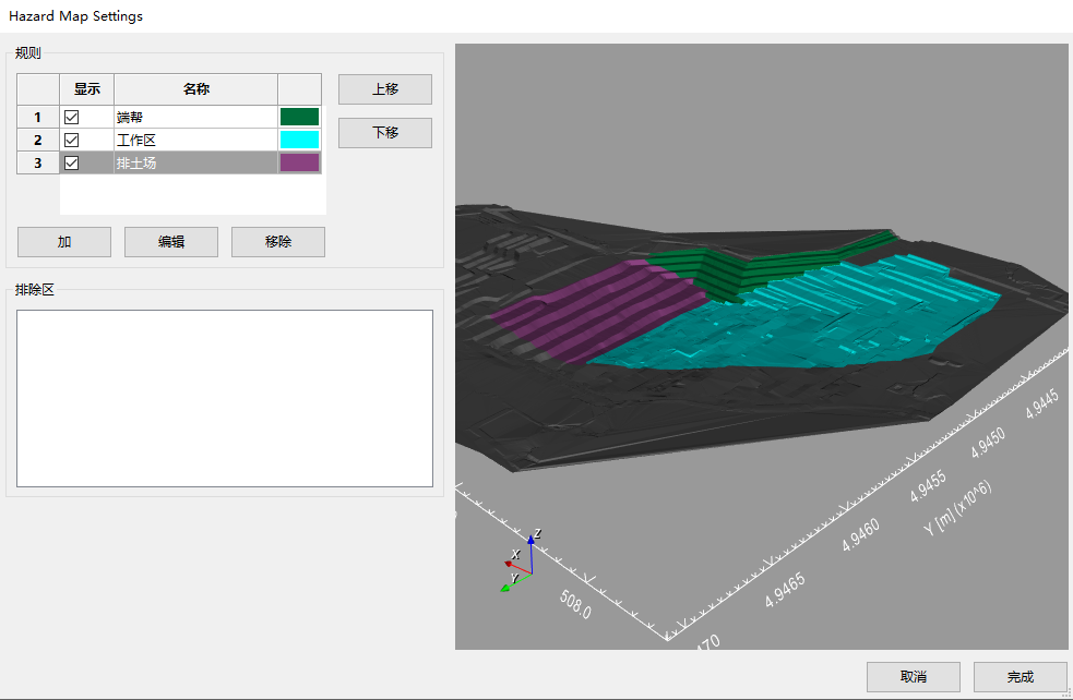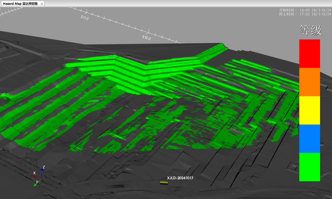 支持在同一预警图中按“红橙黄蓝”四级规则分别为端帮、工作区、排土场设定阈值,避免重复建图,便于后续联网。