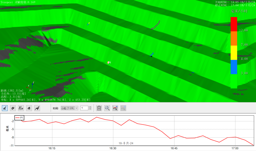 IDS Guardian软件部署于调度中心工作站,自动接收PSV文件并生成波幅、位移、速度、灵敏度及数据质量图。通过加载徕卡GS18单北斗接收机获取的位置信息,导入DTM数字地形模型,将雷达图与DTM模型相互叠加,生成直观三维雷达视图。