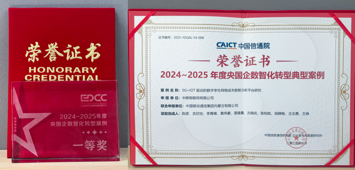 近日,由中国信息通信研究院、中国通信标准化协会联合主办的2024-2025年度央国企数智化转型案例评选结果揭晓。由中国移动物联网公司牵头并联合中国移动通信集团内蒙古有限公司共同完成的AIOT产业物联费控平台项目荣获典型案例一等奖,并获邀参加央国企数智化与转型战略成果发布会。