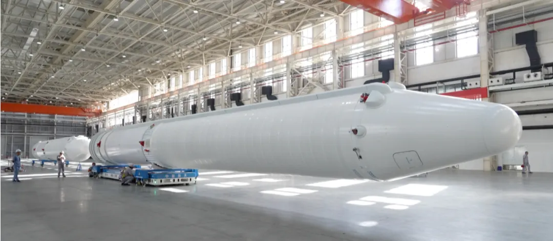 从测控大楼步行至总装测试厂房,小车托举助推器移动,吊具准备同步推进——总装人员利用火箭测试间隙,同步开展下一发长八甲火箭助推器与芯一级的捆绑工作。