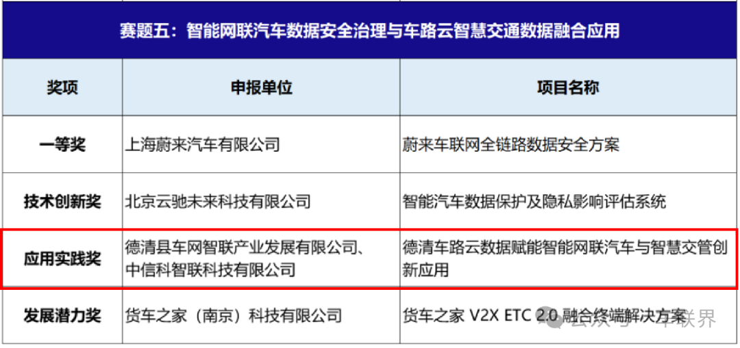 近日,由中国汽车工业协会主办的“数据赋能 乘数而上——汽车数据创新应用大赛”决赛在上海举办。经路演宣讲、答辩评比、专家组合议等环节,德清县车网智联产业发展有限公司联合中信科智联科技有限公司申报的“德清车路云数据赋能智能网联汽车与智慧交管创新应用”项目荣获“智能网联汽车数据安全治理与车路云智慧交通数据融合应用实践奖”,标志着德清在车路云一体化建设运营工作、数据价值挖掘、交管赋能等方面取得的实践成果获得行业协会和产业专家的一致认可。