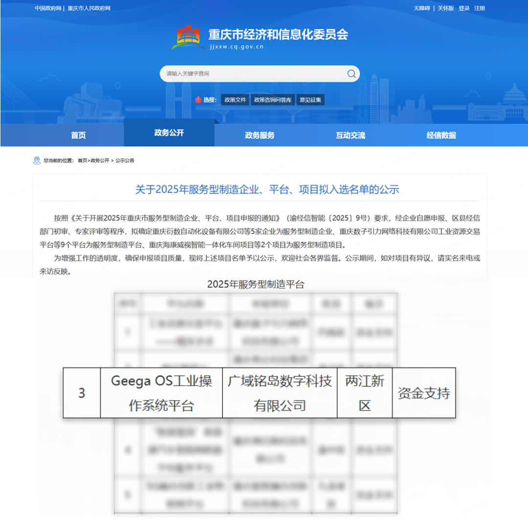 其中,广域铭岛数字科技有限公司自主研发的Geega OS工业操作系统入选服务型制造平台,并由专家评定为市级资金支持项目,成为助推重庆新型工业化进程的又一新引擎。