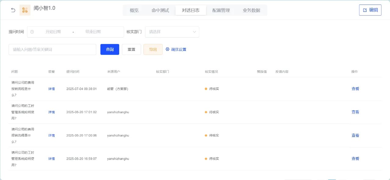 平台提供日常分析和知识库进化管理,运营人员可通过查看对话日志,对问题答案进行溯源核实,对错误的回答予以纠正,审核通过后反哺知识库。