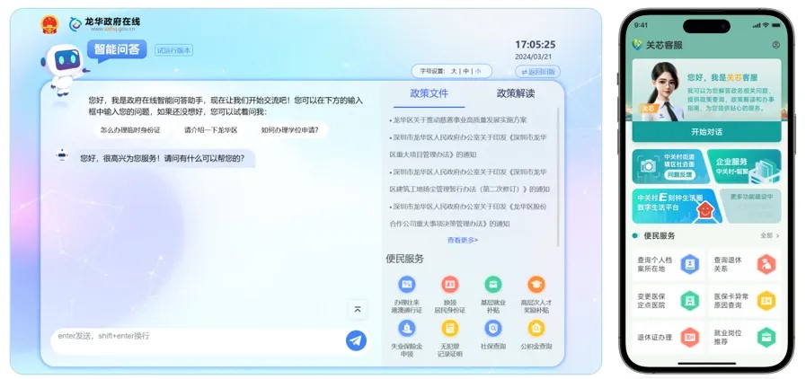 龙华政府网站GPT智能客服:全市首个政府网站GPT智能客服,“善解人意+秒级解答”。上线四个月,实现超3万人次访问、解决2.8万个问题,有效答复率 75% 。