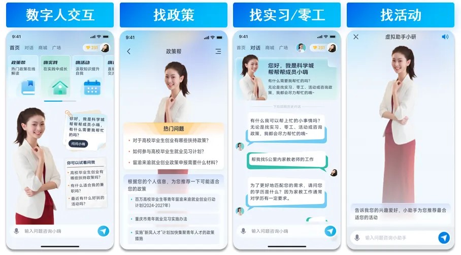 某市科学城智能问答:提供 “找政策、找实习、零工、找活动” 伴随式服务。借大模型+数字人+7×24响应,覆盖成长需求,建一站式服务生态。