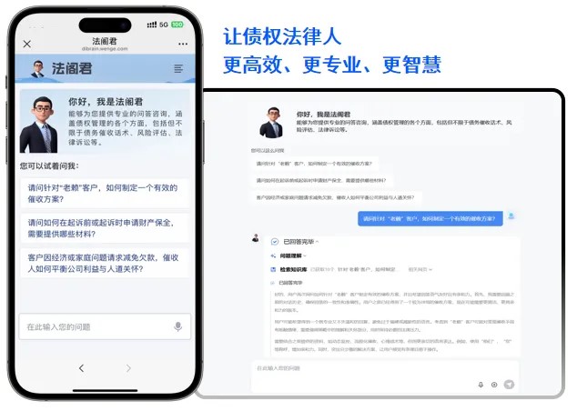 法阁君智能催收:覆盖催收全生命周期,支持多端7×24交互,生成策略、文书,简化流程,提高回款效率。